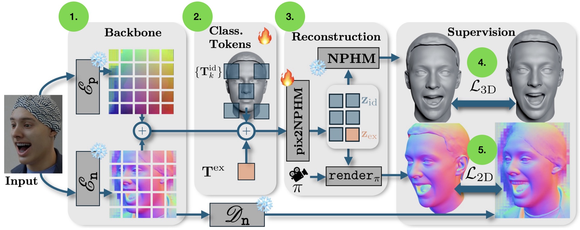 1. The input image is encoded using geometrically pretrained ViTs, which remain frozen during the training of Pix2NPHM. The backbones are pretrained using pixel-aligned surface Normal and position prediction tasks, similar to Pixel3DMM.